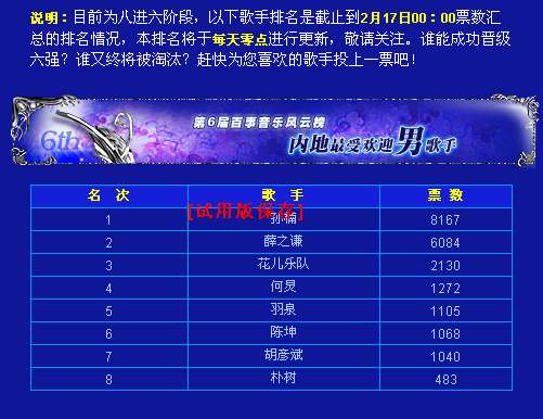 1 薛之谦 3974 2 花儿乐队 1794 3 孙楠 1551 4 何炅 1100 5 羽泉 1008 6 胡彦斌 885 7 陈坤 742 为什么偶刚投了15票,榜却没有变化?
