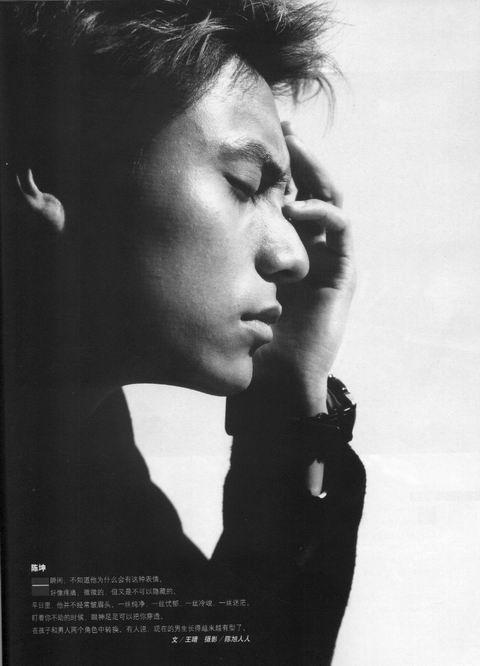 我觉得有一个坤的侧面图不错,还是黑白的。就是坤的左手附在额头上,有点皱眉。你可以试一下。